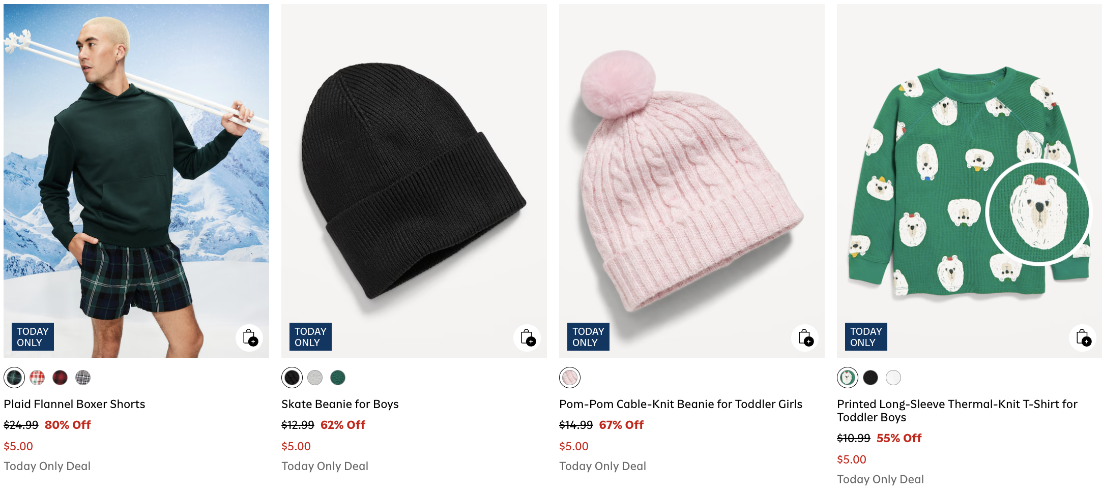 For one day only, head to Old Navy to score $5 deals! Scoop up holiday tees, winter hats, flannel shorts and more! So many fun items for the holidays!