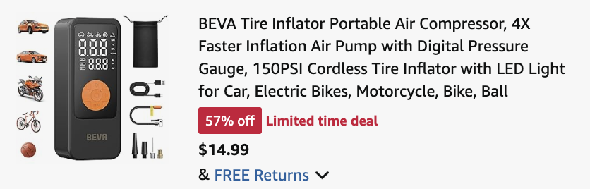 Hurry over to Amazon and use code I76JWRMM to score this BEVA Tire Inflator Portable Air Compressor for just $14.99, regularly $69.99! In just 1 minute, it can increase tire pressure from 26 PSI to 36 PSI!