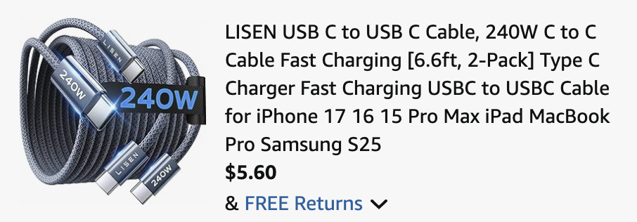 Right now on Amazon, use code WMO2UM2U to score this LISEN USB C to USB C Cable Fast Charging Cord 2-Pack for just $5.60!