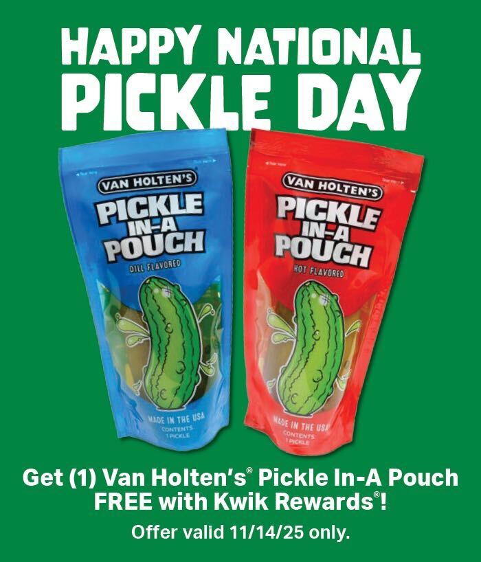 - Kwiktrip: Get one Van Holten’s Pickle In-A Pouch FREE with Kwik Rewards on 11/14/25 only.