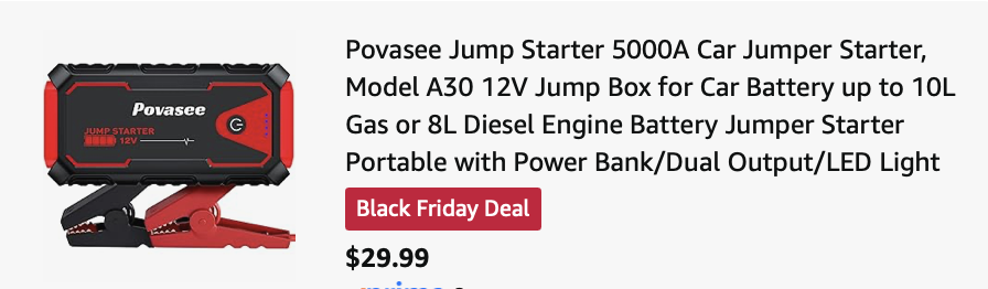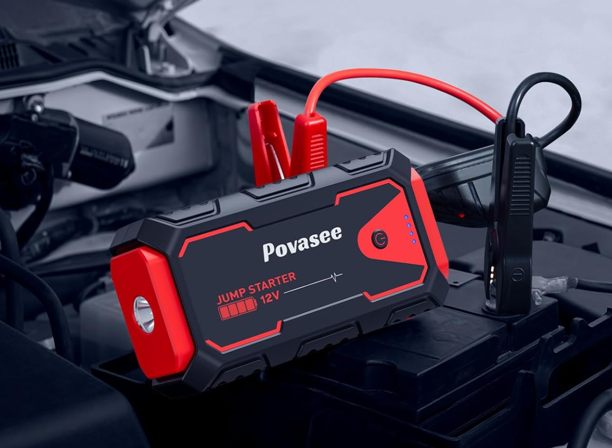 Head to Amazon to get this Povasee 3000A Car Battery Jump Starter for just $29.99, regularly $99.99! Prime Members can use code V3GN83PG at checkout to get the deal! Includes the jump starter, smart jumper cables, a USB-A to C cable, and a carrying case!