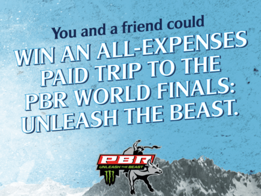 - (3) Grand Prizes - A trip for winner and one guest to Fort Worth, Texas. Travel Dates: May 14, 2026 – May 18, 2026. Prize consists of round-trip coach air transportation, double-occupancy hotel accommodations for four consecutive nights, two 3-day “VIP” passes to the PBR World Finals: Unleash the Beast scheduled to occur on May 14, 2026 – May 17, 2026, $1,000.00 credit for food and beverage, and one $500.00 PBRShop.com credit redeemable at https://pbrshop.com. Terms and conditions received with gift card applies. Approximate Retail Value is $4,000.00.