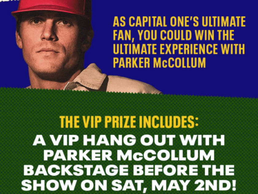 - (1) Prize. The prize winner will receive a trip for two to Austin, Texas for iHeartCountry Festival presented by Capital One. The prize package includes the following: Two round-trip domestic, coach air transportation for the winner and one eligible guest from the major commercial airport nearest winner’s residence within the 50 U.S./D.C. to Austin, Texas; Two nights’ hotel accommodations in one double occupancy, standard hotel room; Two premium tickets to iHeartCountry Festival in Austin, Texas on Saturday, May 2, 2026; Two Capital One Access Passes for access to an exclusive cardholder pre-concert event on Saturday, May 2, 2026; and TBD Artist Experience with Parker McCollum Approximate Retail Value: $5,000.