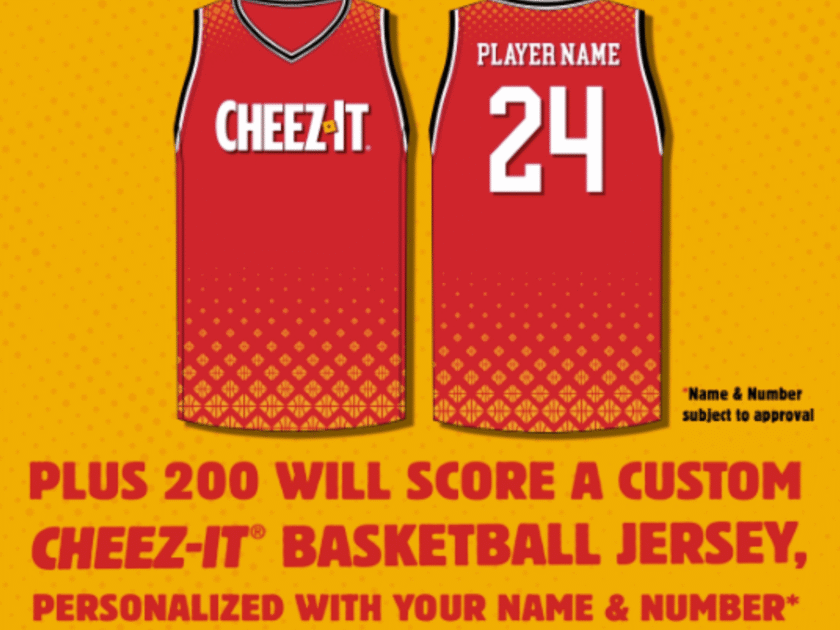 - (200) Secondary Prizes are available. Each Secondary Prize consists of one custom Cheez-It basketball jersey with the winner’s last name and number included on the back of the jersey and choice of number (ARV of each Secondary Prize;$54). Available jersey sizes are Adult Small – Adult 5X. Last name and/or number to be included on back of winner’s jersey is subject to Sponsor’s approval.