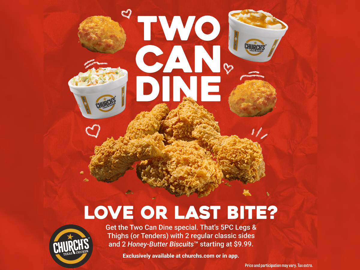 This is just in time for Valentine’s Day! Beginning February 11th, 2026 Church’s Texas Chicken is giving guests a reason to make date night, every night! Introducing Two Can Dine, a new permanent online and app-exclusive meal built for sharing. Starting at $9.99, this crave-able combo makes date night more affordable and includes:
