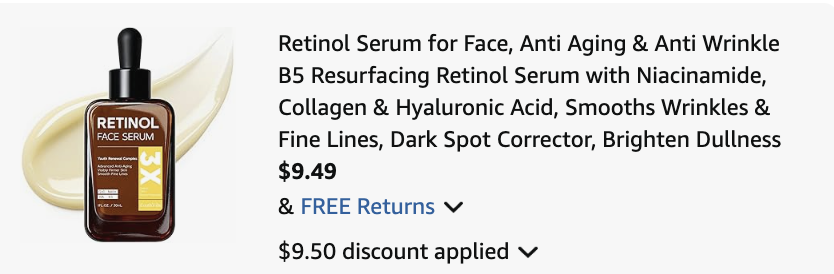 Right now on Amazon, scoop up this highly-rated Retinol Face Serum for just $9.49 with code 2DMR7USH, regularly $22.99!